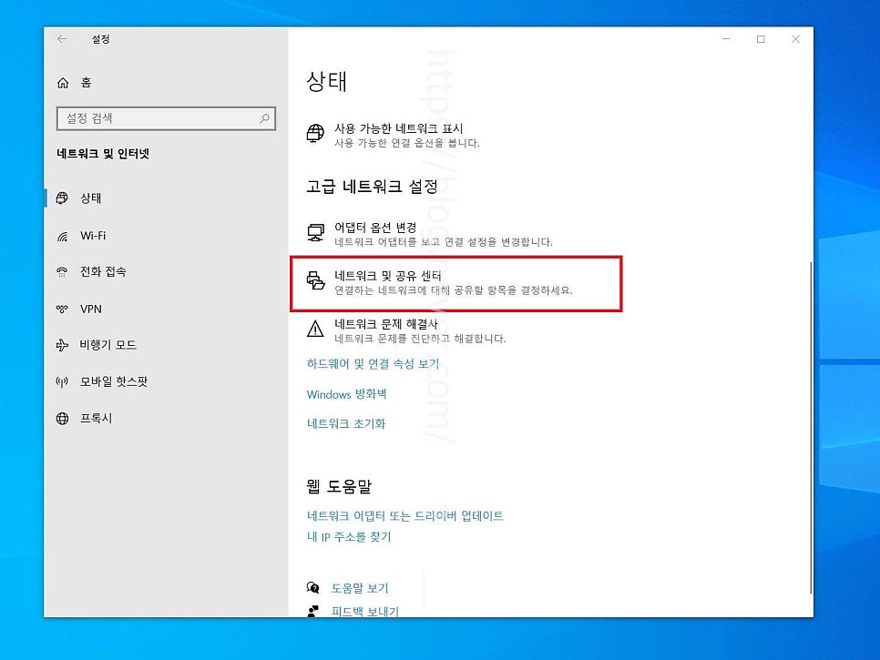 2. 네트워크 및 인터넷 페이지로 넘어왔다면 여기에서는 연결하는 네트워크에 대체 공유 항목을 결정할 수 있는 네트워크 및 공유 센터 항목을 선택해 들어가 줍니다.