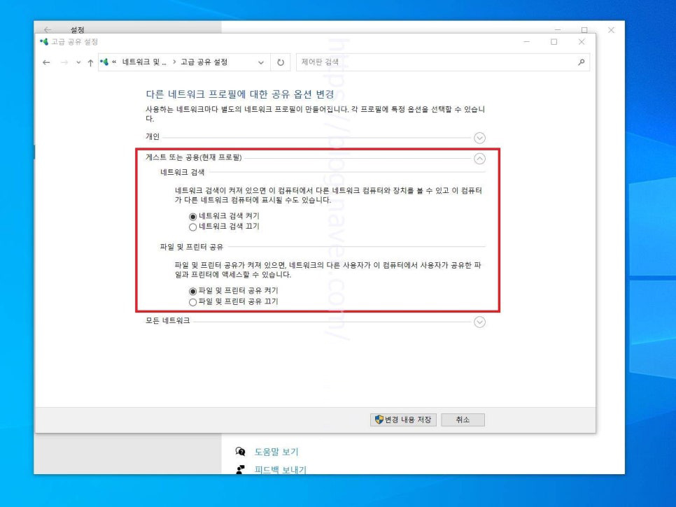 5. 개인 설정을 했다면 바로 아래쪽 게스트 또는 공용(현재 프로필) 목록을 펼쳐주고 네트워크 검색, 파일 및 프린터 공유 옵션을 위와 같이 설정합니다.
