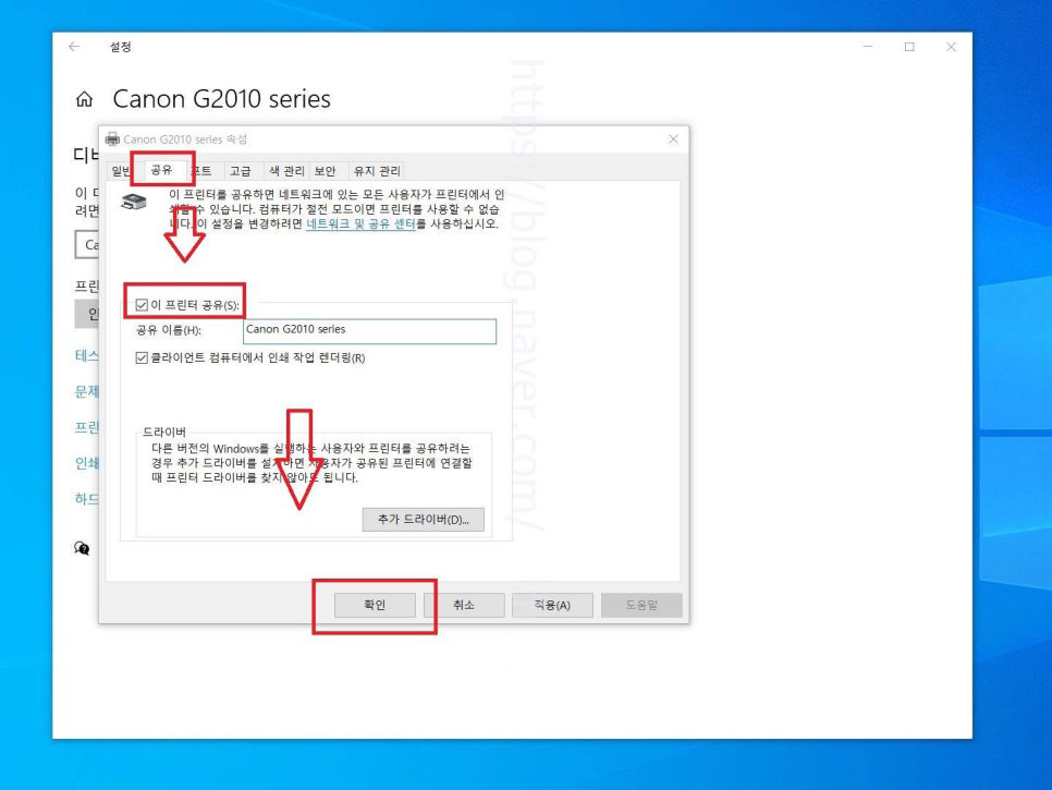 12. 해당 프린터의 속성 팝업창이 뜨면 곧바로 상단 공유 탭을 선택합니다. 그리고 이 프린터 공유를 체크하고 바로 아래쪽 확인 버튼을 누릅니다.