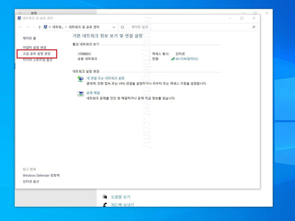 3. 네트워크 및 공유 센터 항목을 누르고 들어오면 해당 팝업창이 뜨는데요 여기에서는 좌측 고급 공유 설정 변경 버튼을 눌러 들어가 줍니다.