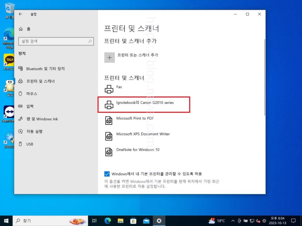 23. 프린터 및 스캐너 화면으로 넘어왔다면 공유 설정한 프린터 항목을 한번 클릭해 선택하여 줍니다.