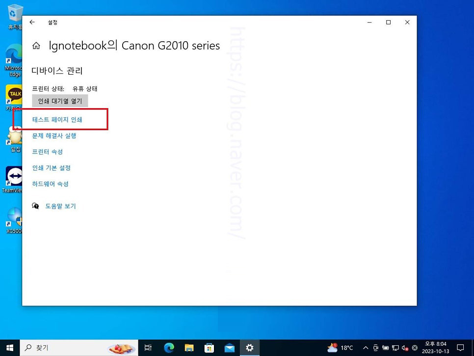 25. 디바이스 관리 페이지로 넘어오면 테스트 페이지 인쇄 버튼을 눌러 테스트로 출력을 진행하고 정상적으로 출력이 된다면 본격적으로 프린터를 사용하면 되겠습니다.