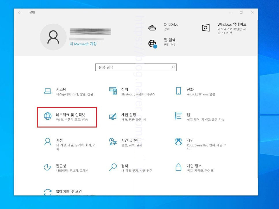 1. 키보드에서 윈도우키 + i키를 눌러주고 설정 팝업창이 뜨면 네트워크 및 인터넷 항목으로 들어가 줍니다.