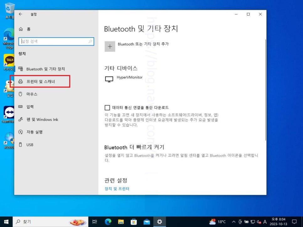 22. 장치 페이지로 넘어오면 좌측에 위치하고 있는 프린터 및 스캐너 항목을 선택하여 들어가 줍니다.