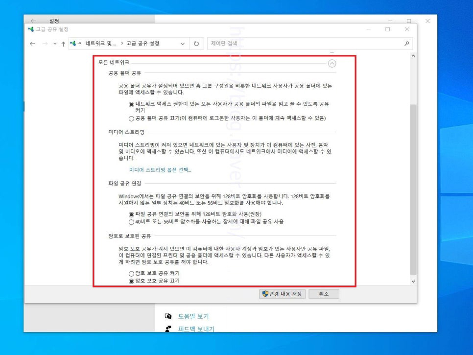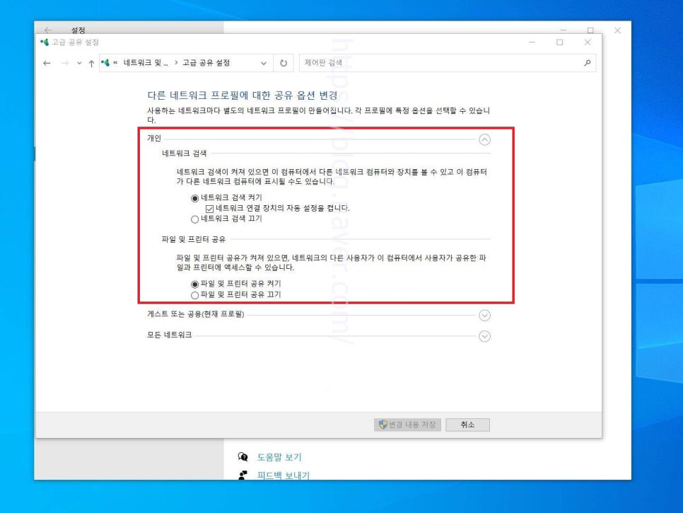 4. 다른 네트워크 프로필에 대한 공유 옵션 변경 페이지로 넘어왔다면 여기에서는 각 프로필에서 옵션을 선택해야 합니다. 우선 개인 목록을 펼쳐주고 위와 같이 옵션을 선택합니다.