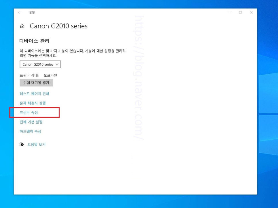 11. 프린터 디바이스 관리 페이지로 넘어왔다면 여기에서는 파란색 글씨 프린터 속성 버튼을 눌러 들어가 줍니다.