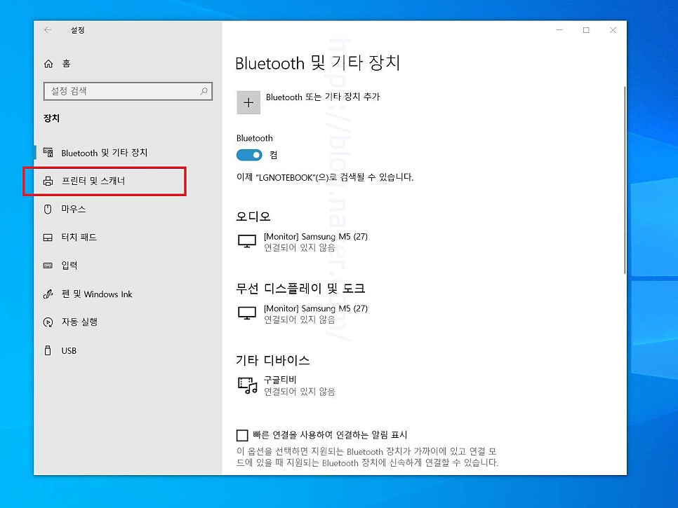 8. 장치 페이지로 넘어왔따면 여기에서는 좌측에 위치하고 있는 프린터 및 스캐너 항목을 선택해 들어가 줍니다.