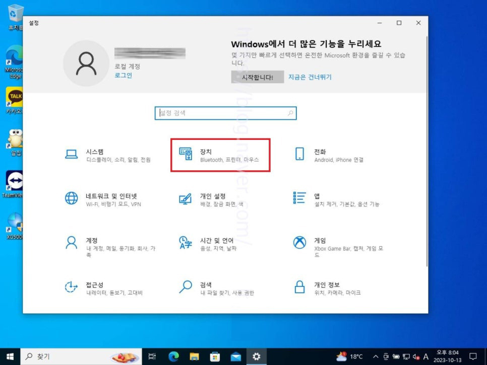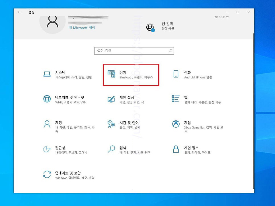7. 네트워크 설정을 끝마치고 다시 설정 메인 페이지로 넘어와 여기에서는 장치 항목을 선택해 들어가 줍니다.