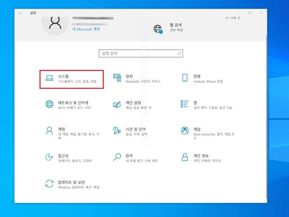 13. 이제 이 프린터를 공유받고자 하는 PC로 이동해 작업을 진행해야 하는데요. 그전에 메인 프린터가 연결되어 있는 PC 장치 이름을 먼저 알아보고 이동하는 것이 좋습니다. 설정 페이지로 이동해 시스템 항목을 눌러 들어가 줍니다.