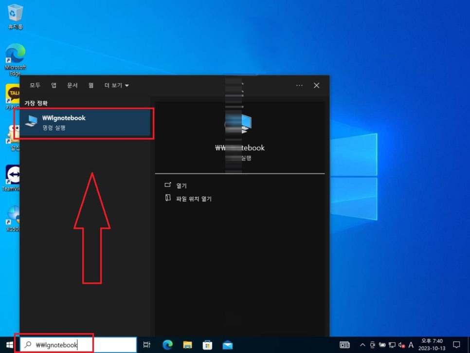 16. 이제 프린터 공유를 받아 사용하고자 하는 PC로 이동합니다. 그리고 윈도우키를 눌러주고 검색 기능을 이용해 \\장치 이름을 입력하고 조회가 됐다면 해당 장치를 선택해 들어갑니다.