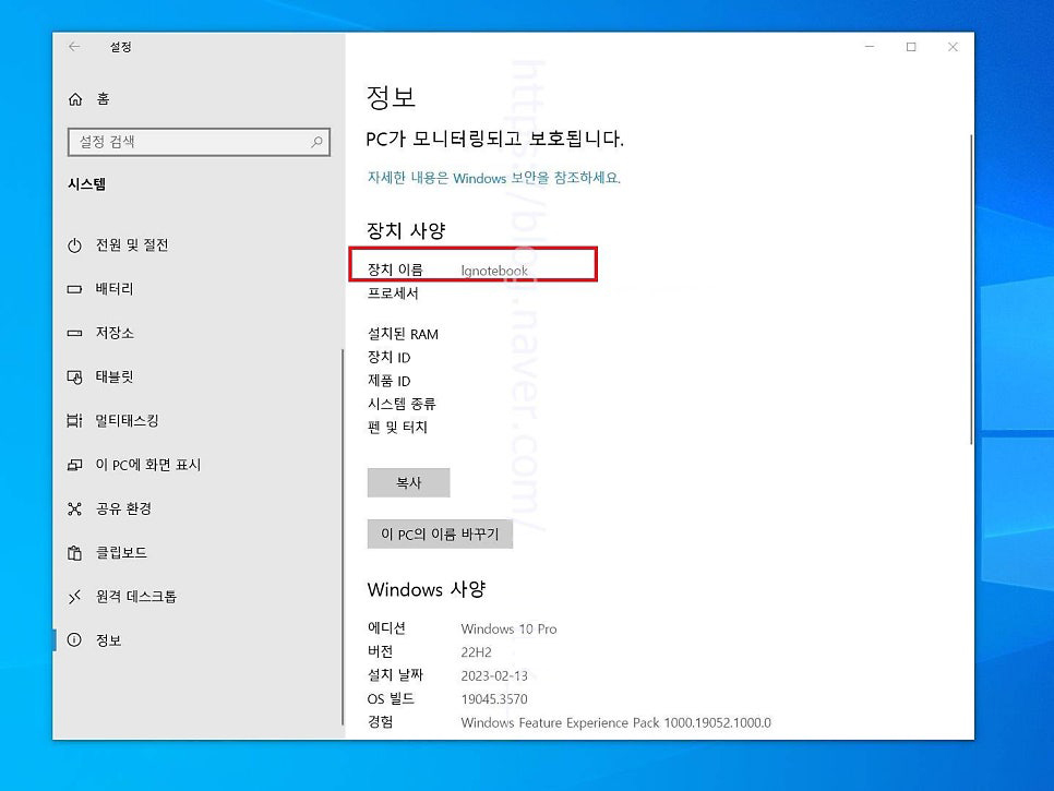 15. 정보 페이지로 넘어왔다면 여기에서 장치 사양 부분에 우치한 해당 PC의 장치 이름을 확인해 볼 수 있습니다. 따로 메모를 하거나 사진을 찍어둡니다.