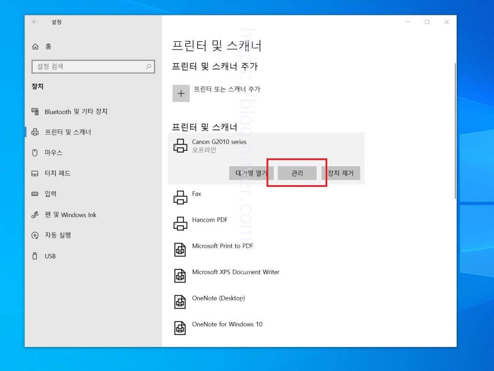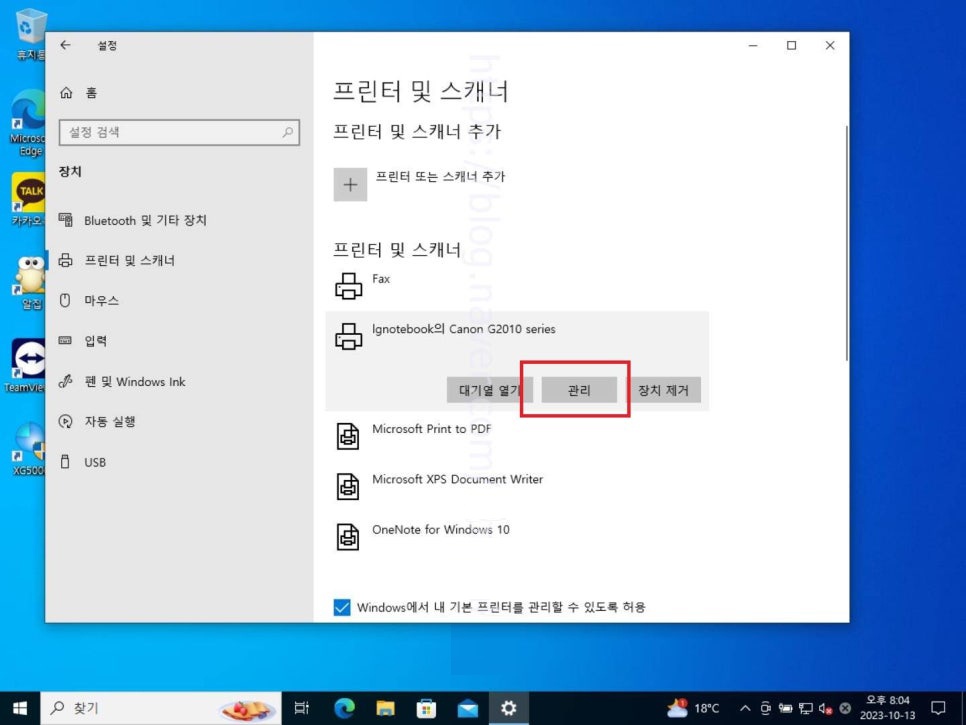 10. 공유하고자 하는 프린터 항목을 선택했다면 3가지 버튼이 보여지는데 여기에서는 관리 버튼을 눌러 들어가 줍니다.