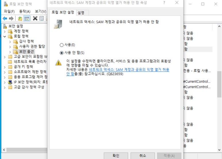 6. 마지막으로 보안옵션 내 SAM 계정과 공유의 익명 열거 허용에 대한 항목을 클릭하여 사용 안함으로 지정해 주시면 공유 프린터 연결오류 문제를 해결할수 있습니다. 이후 네트워크 메뉴에 접근하여 공유되어있는 해당 프린터를 클릭하여 설치를 진행해주시면 0x0000011b 오류 없이 진행됨을 확인할 수 있을 겁니다.